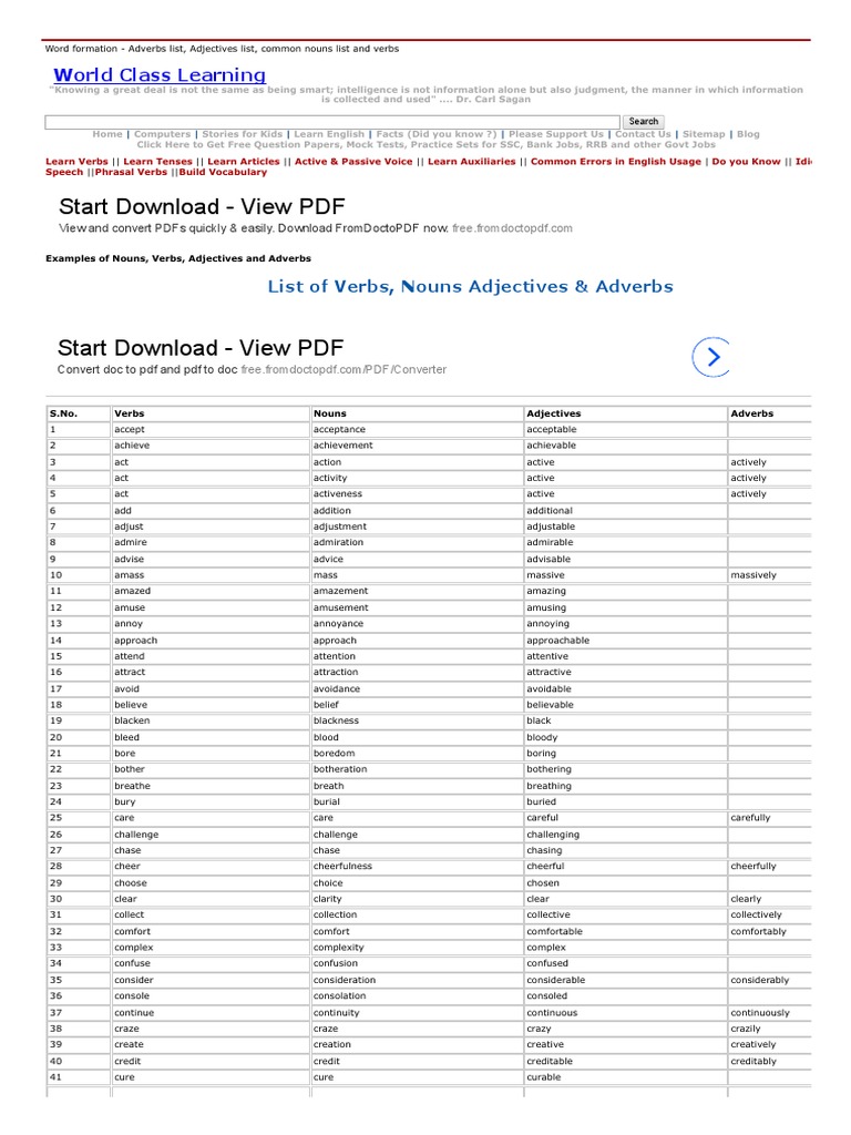 Write negative sentences with full verb forms. You'll be given separate lists of adjectives, adverbs, nouns. Learn noun, verb and adjective preposition combinations adjective + preposition combinations. Children play in the field. Not all words have all the forms, but here are 14 words that do. The best film of the year; Morphologically, verbs have a past tense form and a progressive form. The amended list is included below along with the definitions of each word. Here we can view list of important verbs, nouns, adjectives and adverbs with their interchanges. (superlative of `good') having the most positive qualities; This website provides basic instruction in nouns, pronouns, verbs, adjectives, adverbs, prepositions, conjunctions, interjections and part of speech as well as the standard patterns of english sentences. In many cases, the prepositions. List of medical roots, suffixes and prefixes. wikipedia, the free encyclopedia, 16 aug.